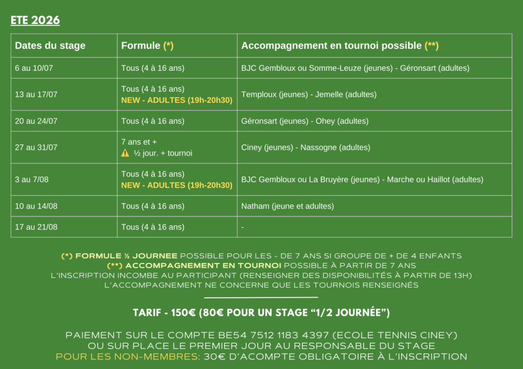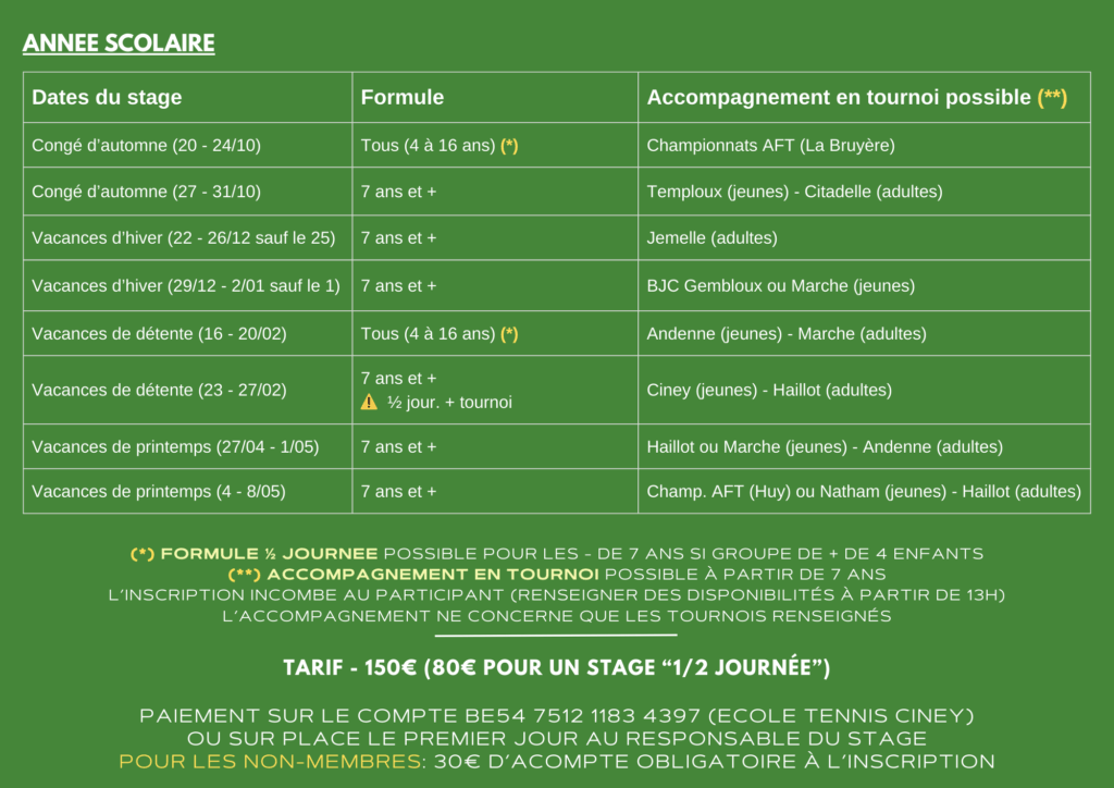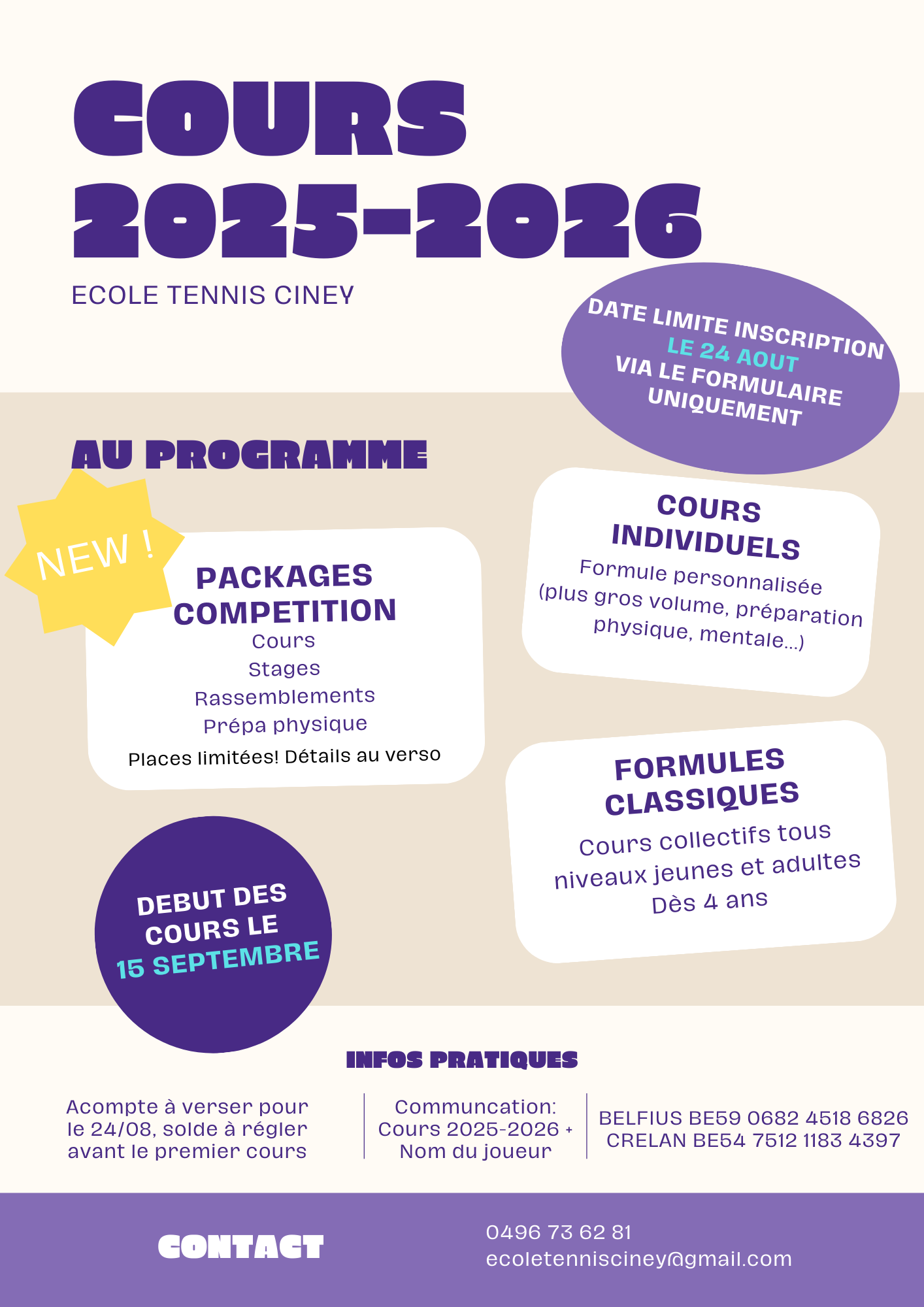 ⚠️ En dehors de cette période, les inscriptions via le formulaire ne seront pas prises en compte. Pour toute question, contactez ecoletennisciney@gmail.com